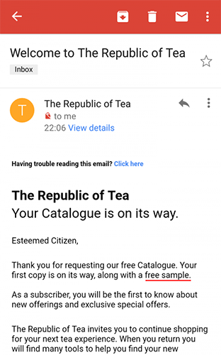 Click the button below, then fill out and submit the request form to get a catalog from The Republic of Tea along with a FREE sample.